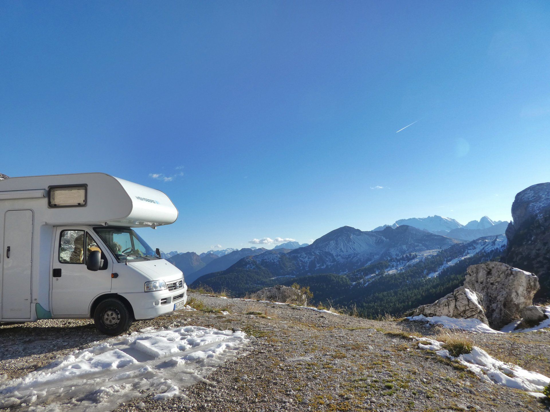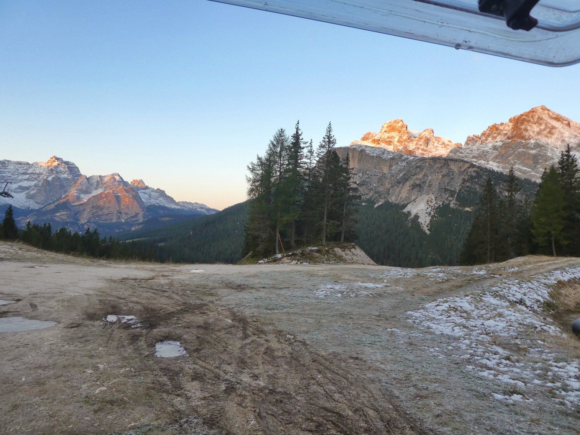 Dann habe ich den Rundweg nicht wie geplant fortgesetzt, sondern bin umgedreht und habe den kurzen Weg wieder zurück zum Ausgangspunkt genommen. Während die Jungs bei dem Busfahrer auf dem Hinweg noch einen Maulkorb brauchten, war der Busfahrer vom Rückweg ganz verzückt von den mitfahrenden Hunden. Wäre der Weg nicht so kurvig gewesen, die Busfahrer rasen da auch noch wie sonst was, man fühlt sich wenn man vorn sitzt ein wenig wie in der Wilden Maus, hätten sie schon im Bus tief und fest geschlafen. So mussten sie damit warten bis wir wieder zurück am Auto waren. Während die Jungs schon mal mit nickern beschäftigt waren, haben ich die Blechkothe wieder Abfahrbereit gemacht und dann ging es noch mal ein paar Km weiter. Wieder wurde ein toller Platz für die Nacht gefunden, direkt oben am Valparola Pass auf einem Parkplatz mit einer grandiosen Aussicht auf den Col di Lana, die Marmolada und direkt neben dem Hexenstein und dem Lagazuoi im Rücken.
