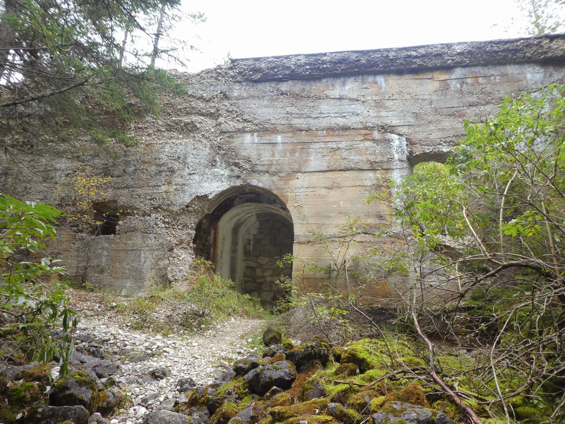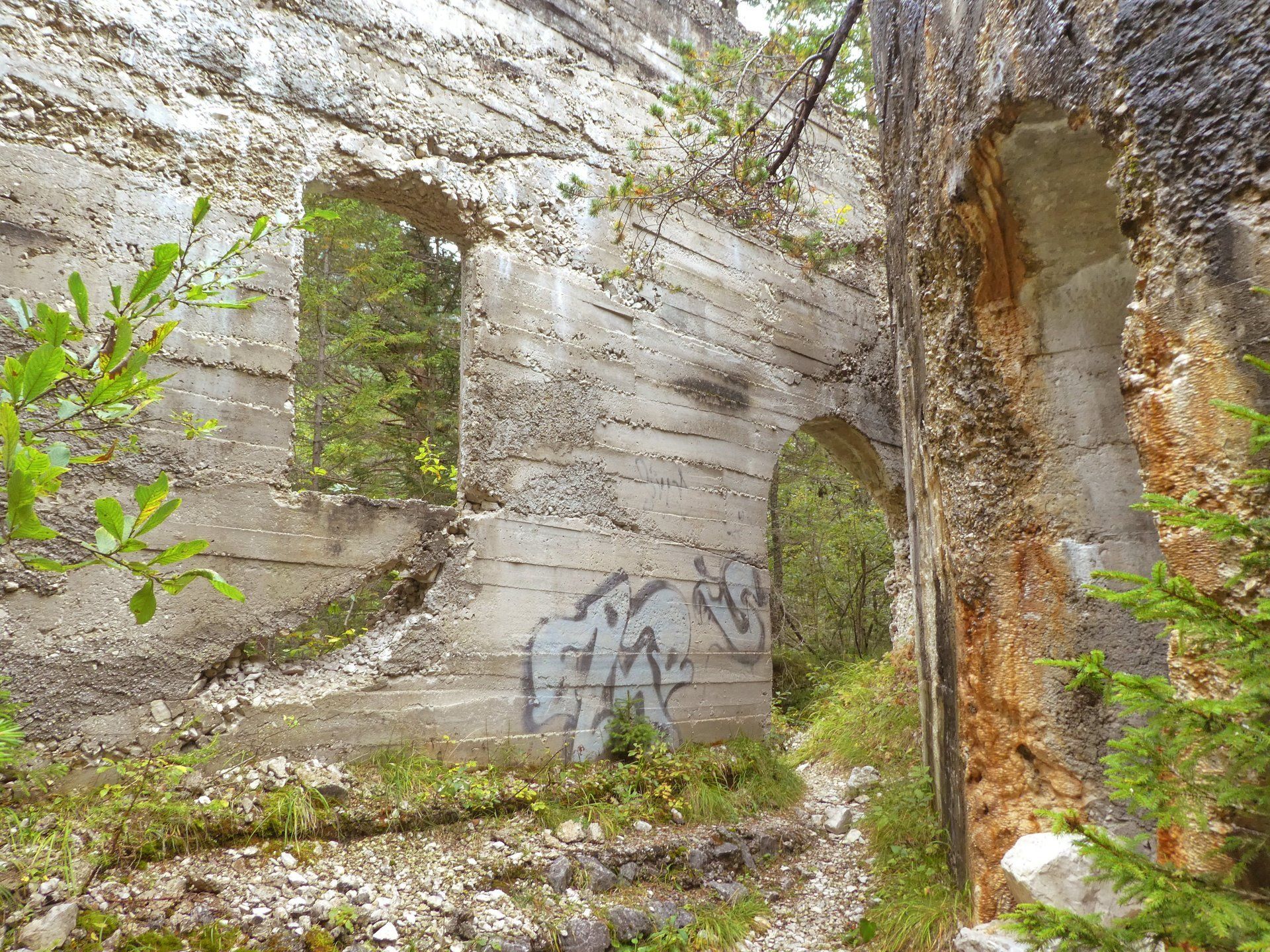 Die Ruine ist unter dem Begriff Werk Landro sogar in meinem Wanderführer beschrieben, das habe ich allerdings erst hinterher gesehen. Die Österreicher hatten diese Stellung erbaut, um den Italinern den Weg ins Pustertal zu versperren, allerdings wurde das Werk nie in Kampfhandlungen verwickelt. Leider ist nicht genauer beschieben, ob das Werk auch als Krankenstation gedient hat, wie das große weiße Kreuz an der Außenseite vermuten lässt. An die Aufbewahung von Toten wurde aber scheinbar gedacht.