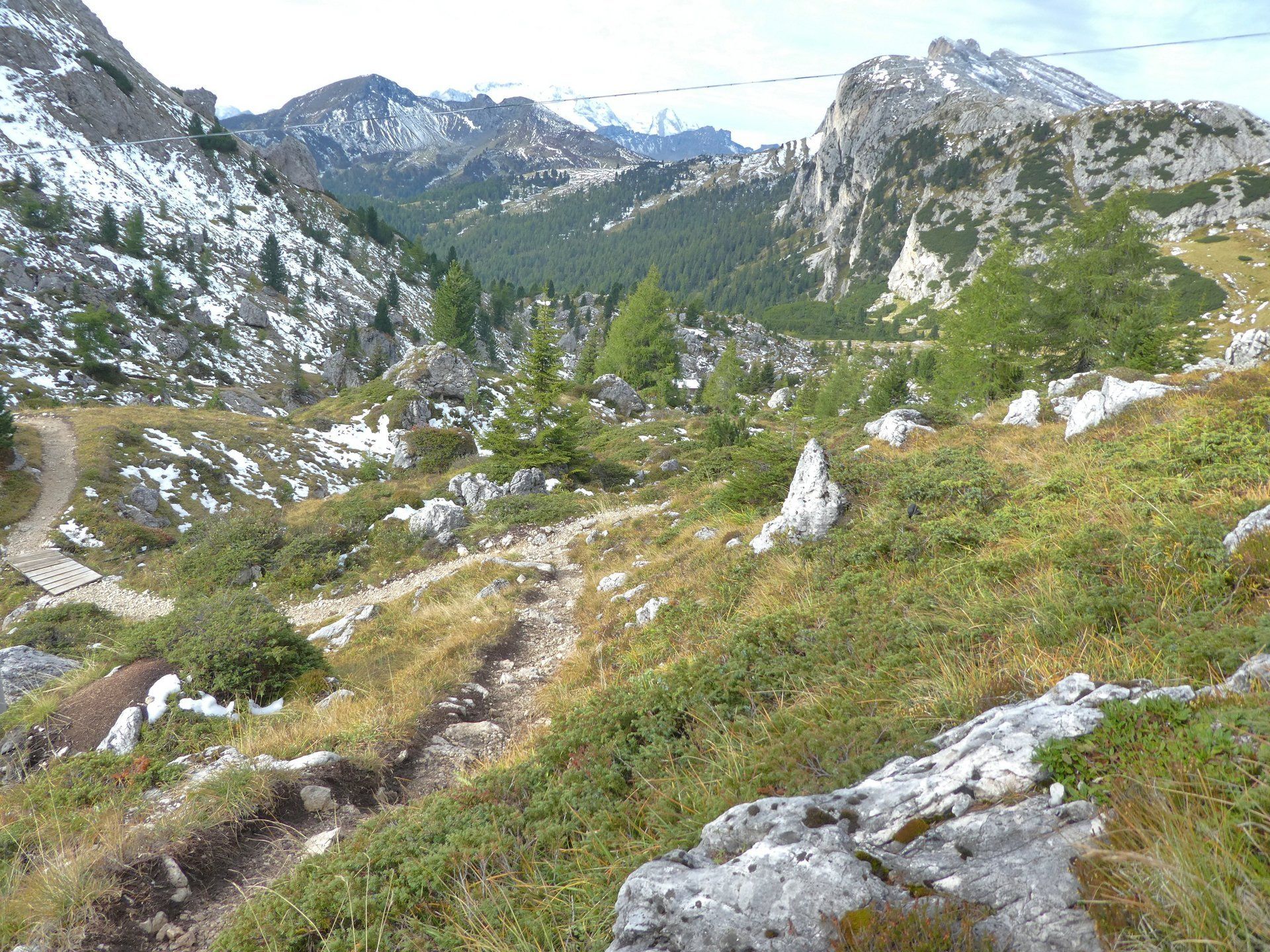 Nach gut 1 ½ Stunden entschied ich mich von meinem Plan abzuweichen und umzudrehen, es sah so aus, als würde das Wetter umschlagen und der Weg machte einen deutlich weiteren Eindruck als ich es gedacht hätte. Also ging es den Pfad und den gesicherten Stieg wieder zurück Richtung Valparola Pass. Am Abend zuvor hatte ich beobachtet wie zwei junge Slowenen einen Namen losen Gipfel, aber mit Kreuz ausgestattet, in nicht mal 1 ½ Stunden bestiegen und wieder zurück am Fahrzeug waren, bestiegen hatten, so machte ich noch einen Abstecher zu eben jenem. Der Aufstieg war auch gar nicht so schwierig, es gab sogar einen Wegemarkierung, allerdings keinen sichtbaren Weg mehr. Scheinen nicht so viele Wanderer einzuplanen dieses Gipfelchen. Von dem man dennoch einen tollen Blick hatte.