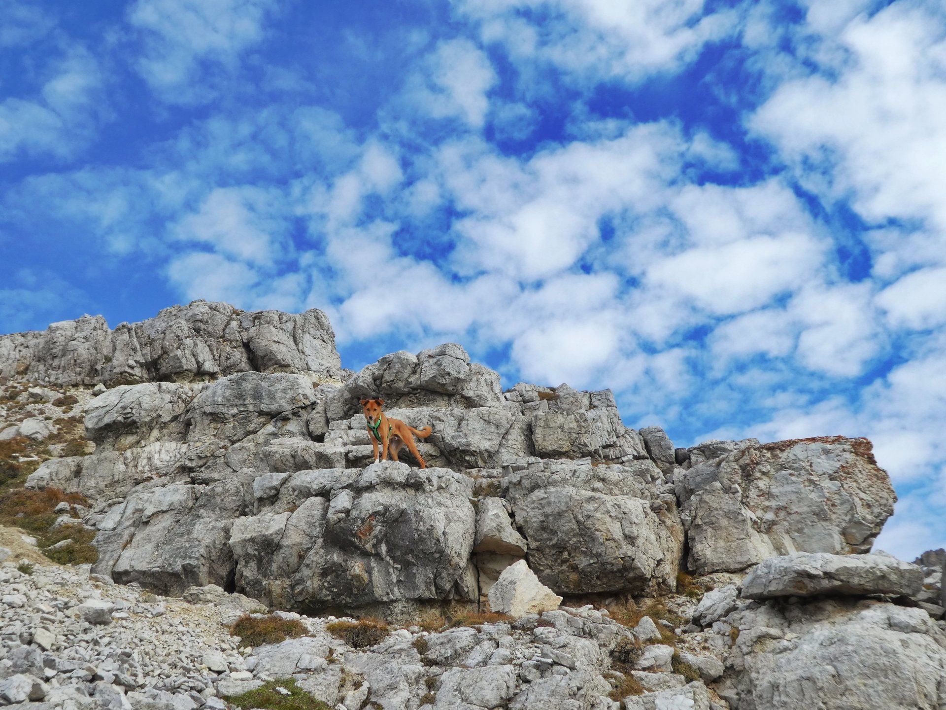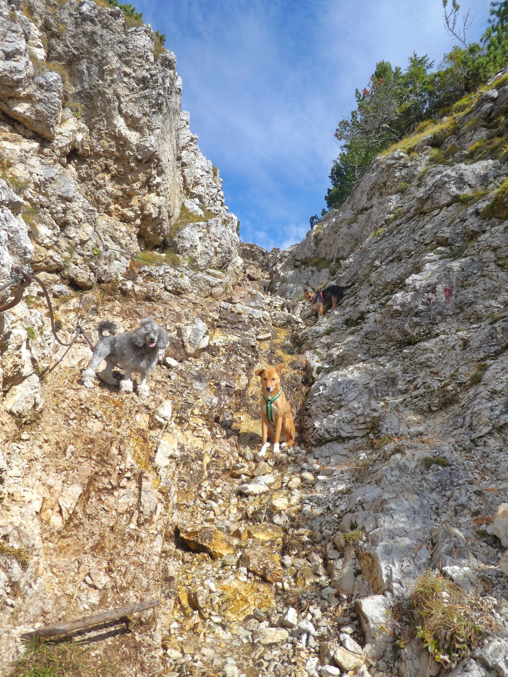 Den Weg fortsetzend überraschte uns ein kleiner gesicherter Steig, ein Bächlein hatte eine Schneise ins Gestein gegraben. Für die Hunde war es gar kein Problem und auch ich stieg einfach über Felsen und eingelassene Eisenstufen hinab.