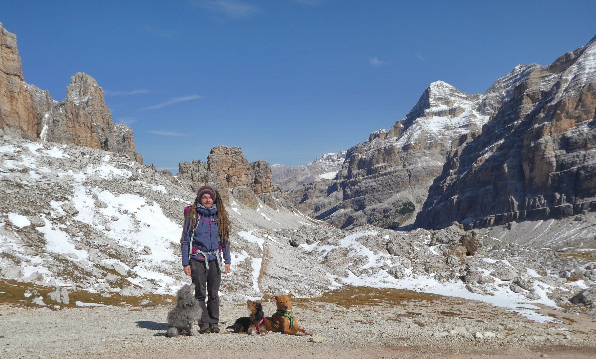 Dieser wurde im Krieg erst von den Österreichern und dann von den Italienern jeweils mit Mienen versehen und so riesige Mengen abgesprengt, auch dies kann man heute noch gut an den herum liegenden Felsblöcken sehen. Die Bahn hat nur einen Mast und auf Grund des Windes wackelte es doch ganz ordentlich, aber die Jungs waren ganz tapfer. Außerdem hatten sie eh einen anderen Plan, es gab erstens viele Menschen die man auffordern konnte gestreichelt zu werden und außerdem noch einen anderen Hund den man ganz genau im Auge behalten musste, wer weiß was der vor hatte!?