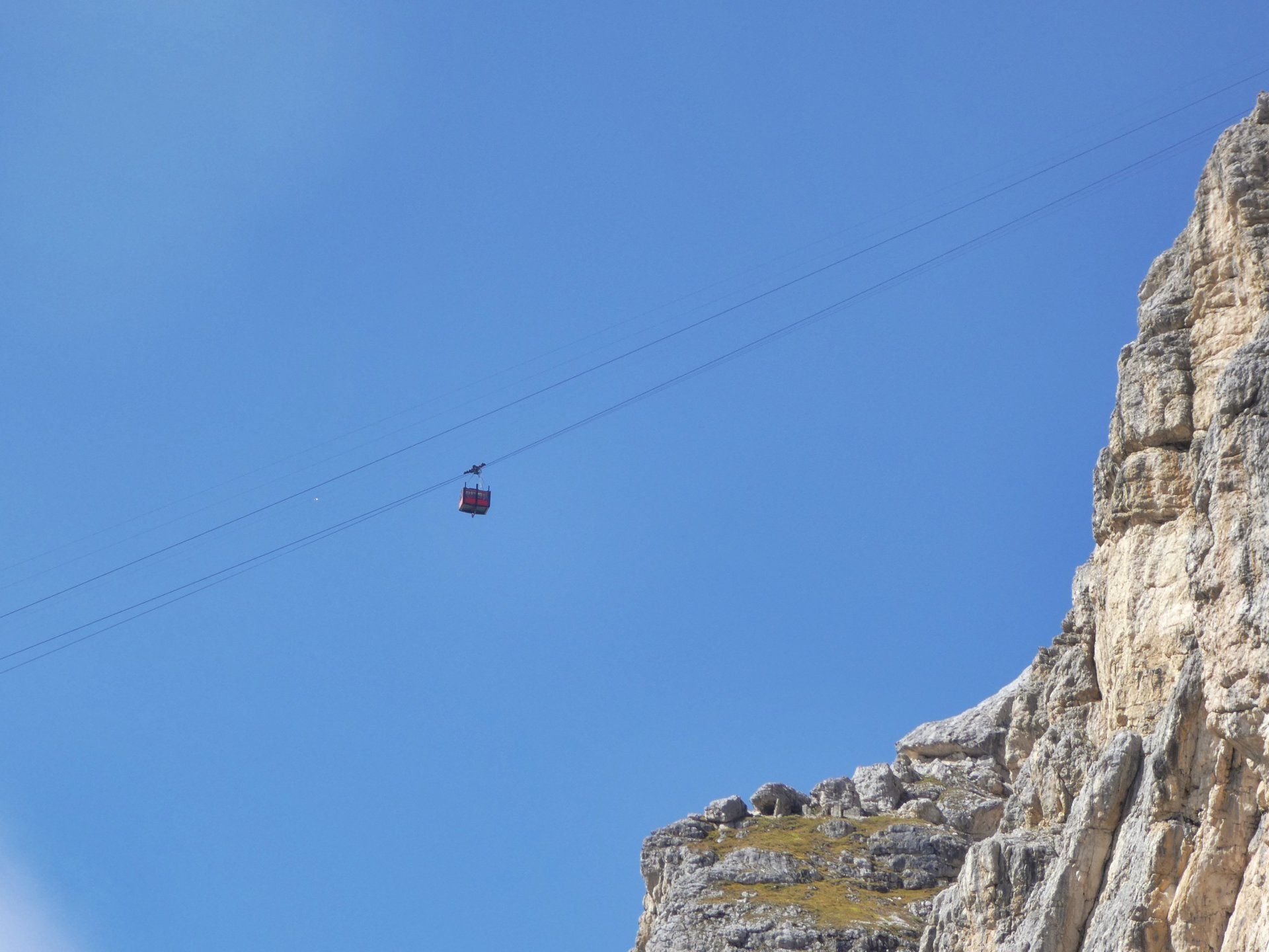 Wir haben vom Falzarego Pass aus die Seilbahn auf den kleinen Lagazuoi genommen. Das war überraschend kostengünstig 11 Euro pro Person, die Hunde haben nix gekostet und brauchten auch keinen Maulkorb tragen, obwohl die schon Griffbereit am Rucksack baumelten. So ging es also mit einer Großraumkabienenbahn hinauf zum Gipfel.